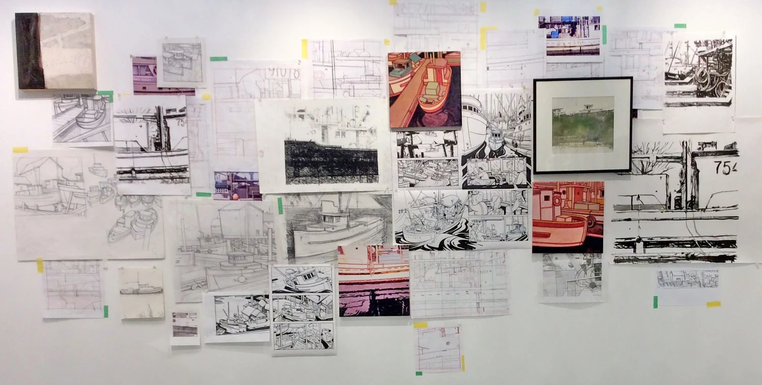 Reference, preliminary drawings, sketches for the show. Graphite, conte, WC, acrylic india ink.